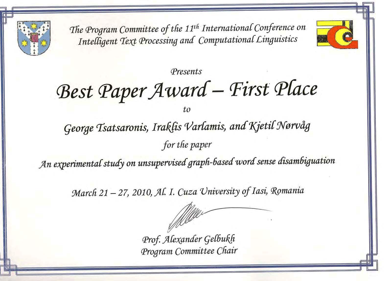 - 27-03-2010: Our paper "An Experimental Study on Unsupervised Graph-based Word Sense Disambiguation" won the Best Paper Award at the 11th International Conference on Intelligent Text Processing and Computational Linguistics (CICLING 2010)
